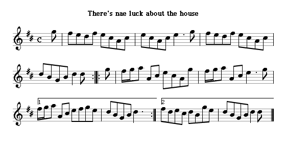 An example of the formats I use for the tunes; it's an earlier (and barely recognizable) form of the tune I used on the Old Scottish Flute Music page, this time as a reel rather than a strathspey.