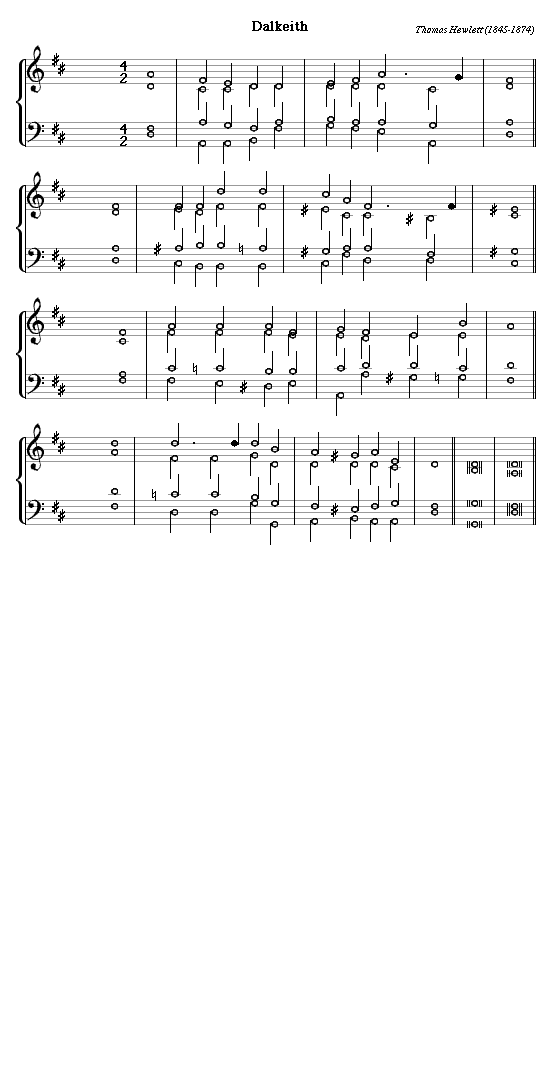 Older hymn tunes, or adapted secular tunes, were often given local names when a British congregation adopted them; and if a new tune was given such a name by its composer (like Andrew Thomson's St George's, Edinburgh) it often stuck. The first probably happened in Dalkeith churches, but I have not traced any such renamings. There is, however, a Welsh hymn called Dalkeith - presumably named at random when the names of most larger towns in Britain had already been spoken for.