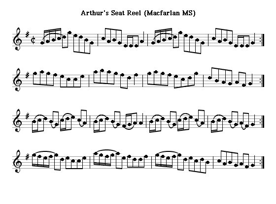 There have been many tunes dedicated to Arthur's Seat. The first Arthur's Seat Reel appears both in the Macfarlan Manuscript and in Oswald's Caledonian Pocket Companion. I've printed the Macfarlan version, but the last note in bar 6 is from Oswald; it's the E below in the original, which I think is one of Young's few mistakes. The second Arthur's Seat Reel is by the prolific and talented fiddle composer William Marshall (1748-1833). Arthur's Seat Strathspey is a pipe tune by W. Robb. Arthur's Seat Hornpipe is a totally untraditional piece of chromatic showing-off by the most successful Scottish fiddle virtuoso of all time, J. Scott Skinner (1843-1927).