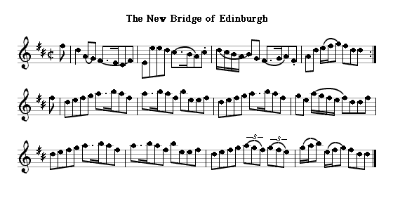 He went on to suggest a scale of charges by social rank of the client, from peers of the realm downward, with married men paying double and the city taking 50%. (This is the earliest reference I know of to whipping as a service in brothels; it predates Sade by several years and the implication is that it was a commonplace in Edinburgh at the time). The New Bridge of Edinburgh is taken from the Brysson/Sharpe manuscript; it has some motifs in common with the familiar reel The Duke of Perth, and would go well with it. The first tune titled The North Bridge is from John Anderson's A Collection of New Highland Strathspey Reels. The better-known The North Bridge of Edinburgh is a plagiarism by the Gows of a tune published in two keys under two different names by William Marshall: Miss Watson in B minor like the Gows' version, and the one printed here, Belhelvie House, in the difficult key of C minor (he is reported to have said of pieces like this "I do not write for bunglers - if you find my tunes difficult, practice"). Belhelvie, also known as Blackdog, is the estate of a branch of the Skene family in Aberdeenshire. As usual, the Gows' title stuck. The tune was turned into a reel in Ireland, as The Musical Priest.