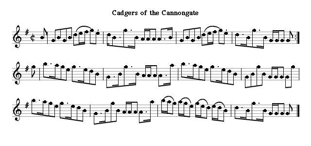 Other groups of workers had organizations that functioned like guilds without having the same political power. Cadgers were porters, carrying goods through the narrow closes of the Old Town where carts or pack animals could not go; they also acted as guides and bodyguards and formed a close-knit society, often more effective at police work than the official forces. "Caddies" in golf were at first cadgers taking on a new line of business. Cadgers of the Canongate is a very old dance tune; I've taken it from the Gows. In settings for the flute or pipes, it's known as Dalkeith Fair. Cadger Watty is taken from Oswald's Caledonian Pocket Companion.