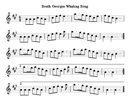 The Salvesen Song, from the 1930s, is a composite of two versions, one from an oral history pamphlet researched in the 1980s and the other published in an Aberdeen folk magazine in the 1960s. The tune is the Dundee song popularized by music hall, The Old Maid in her Garret. The South Georgia Whaling Song comes from a collection of bagpipe music published by Iain McCrimmon in Canada in the 1980s. He transcribed it from the Gaelic singing of Norman Maclean, but I have not traced the recording he used.