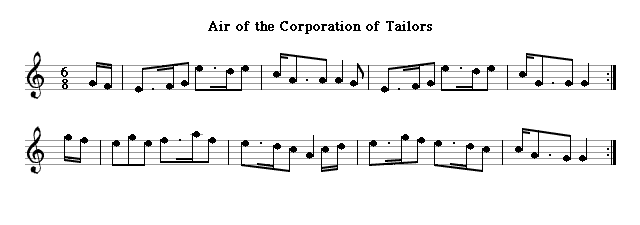 The Air of the Corporation of Tailors was used by Burns for his song The Taylor fell thro' the bed and also for a bawdy song in The Merry Muses of Caledonia, I rede you beware of the ripples young man. The Fleshers (butchers) were another of Edinburgh's trade guilds. The "Fleshouirs Seill of Cause" of 1488 contains an early example of food hygiene regulation, with ferocious penalties including imprisonment, confiscation of goods and permanent banishment from the city. Of course the main point of that statute was not to protect the public but to shut out competitors; in particular, Leith butchers and fishmongers were targeted for a boycott. The Fleshers Rant comes from Sharpe of Hoddom's manuscript. The Wrights Rant is a variant of The Stool of Repentance, published by Aird late in the 18th century; the strange-sounding G in the fourth bar, which would be an A in the modern version, is the way it is in the book. The Bakers Rant is from, appropriately, the Baxter Manuscript of the early 18th century. The bakers (baxters) were the oldest of the Edinburgh guilds, incorporated in 1522.