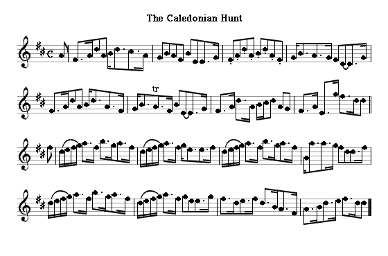 As in most of Britain, hunting was one of the most important recreations for the wealthy; and not simply riding after foxes, but the dancing, drinking, gambling and whoring that went with it. The Royal Caledonian Hunt was the most prestigious of the hunts in Scotland. It was organized from Edinburgh, but moved its meetings from town to town around the country. The Caledonian Hunt, by Sir Alexander Don, is from volume IV of James Aird's collection of the 1780s. The Royal Caledonian Hunt's Delight, written by Mr James Miller of the Teind Office and published by the Gows, was already famous when Burns used it for Ye Banks and Braes of Bonnie Doon; the version here is the one the Gows published. It was probably an unwitting adaptation by Miller of an older English tune, Lost is My Quiet For Ever, which was first published without a title by Playford in 1690 and which was already known to Burns and his friends. The first event in the newly opened George Street Assembly Rooms, in 1787, was the ball of the Royal Caledonian Hunt; Miller's version probably dates from around then. North's (Milles Macphail) Farewell to the Caledonian Hunt is a much less familiar but equally good tune from the Gows' Fourth Collection. Both collectively and as individuals, the Hunt were important patrons of music and poetry. At the Earl of Glencairn's initiative, they placed a bulk order for the first Edinburgh edition of Burns, and Nathaniel Gow was still dedicating his collections to them forty years later. Nonetheless, Burns seems to have concluded that they were a gang of brainless drunken yahoos.
