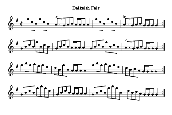 The fair in Dalkeith was the next most important one in the Lothians, and persisted, mainly as a horse fair, until late in the 19th century. Dalkeith Fair is a version of the tune earlier printed as Cadgers of the Canongate. I've taken it from a 19th century collection of flute music, and have also given an arrangement for the Highland pipes of the 1890s by David Glen, which is unusual for a pipe tune by putting it in G. This sort of works because his version of the tune has a gapped hexatonic scale with the C missing, but all pipe tunes in G sound strange because of the unusual tuning of the Gs themselves and the violent dissonance of the A drones.