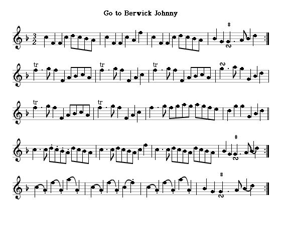 The last few Dalkeith pipers are well-documented and had rather more conventional work. George (Geordie) Sime (1700-1790), a chubby figure depicted by Kay, used to make the rounds of the town daily at 5am and 8pm; most towns in Scotland had employed a musician to do this since the Middle Ages. His successor Jamie Reid was piper to the town of Dalkeith until 1810. According to the cartoonist John Kay, one of his duties was to welcome the Duchess of Buccleuch on her return to Dalkeith House by standing on a high point about a mile out of town and playing Dalkeith has got a rare thing, a tune never written down under that name, and bid her goodbye by playing the 3/2 hornpipe Go to Berwick Johnny which I've taken in a fiddle version from the Gows' Complete Repository of the early 1800s. I believe the first tune may be one notated in a manuscript of around 1675 which seems to have been connected with the Scotts of Buccleuch. It's called The Baggpipe Tune, which suggests there's something distinctive about it; if it were the town anthem of Dalkeith and the family fanfare of its feudal owners, that would explain it. It's in scordatura notation for the fiddle, with the G string raised to A to provide a few unisons, and has a third part added which goes beyond the range of the pipes. But the first two parts fit the pipes perfectly, and it's a 3/2 hornpipe like its complement. It's the earliest-notated pipe tune from Scotland.