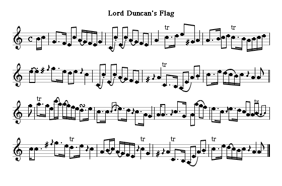 Admiral Duncan was Edinburgh's most notable naval hero, after defeating the Dutch at Camperdown in 1797, the most decisive naval battle of the 18th century. The victory was marked by a huge parade of the Volunteers, carrying Duncan's flag through the streets and round George Square in front of his house. It inspired a flood of commemorative pieces, such as Great News from Camperdown, from Nathaniel Gow's 1797 collection (this gets an oddly mistaken note in Alois Fleischmann's Sources of Irish Traditional Music: "Northumberland, or Forfarshire" - Fleischmann must have been looking for topographical rather than historical associations). Others are Lord Duncan's Flag, also by Nathaniel Gow and taken from the 1819 reprint in The Beauties of Niel Gow, and Lord Duncan's Victory by William Campbell from his New and Favorite Country Dances. But that year had also seen the most determined mutinies the Royal Navy had ever had to contend with. The balladeers rose to the challenge, and produced the inevitable appalling adaptation of The Garb of Old Gaul for the occasion: Britain's Triumph, or the Dutch Well Dressed; A Song Occasioned by Admiral Duncan's Victory over the Dutch, whose chorus tries very hard to forget that British patriotic zeal had sometimes been in short supply: