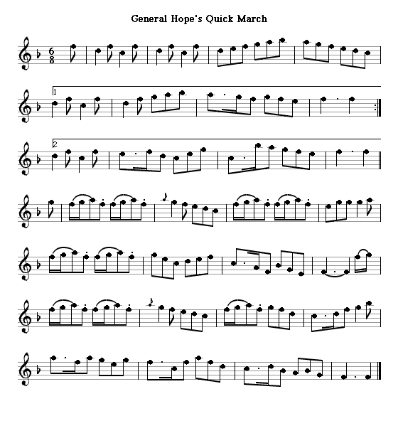 Lord President Hope was in charge of the First Royal Edinburgh Volunteers from their inception in 1794 to their dissolution in 1820. Recruitment must have been made difficult by his fanatical distaste for both tobacco and alcohol; he used to examine would-be soldiers by smelling them for traces of either. Colonel Hope's (of the 1st R.E.V.) Quick Step is by Nathaniel Gow; clearly meant more for the ballroom than the battlefield. General Hope's Quick March is from William Campbell's 24th Book of Country Dances.