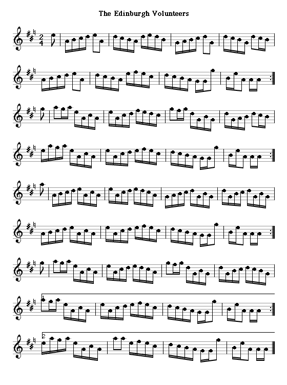 The Volunteers March is from the Brysson/Sharpe MS of the 1790s; the more interesting Edinburgh Volunteers March was published by Aird. The Edinburgh Volunteers March and Quick Step are by the local composer John Watlen, who also wrote The Leith Volunteers Quick Step, the second half of a "Grand March" which began with a very pianistic slow march that defeated my ability to transcribe it into ABC. Slow March of the Mid-Lothian Volunteer Artillery (with an opening phrase that recalls Macpherson's Farewell) and Quick Step of the M.L.V. Artillery are from an undated printed sheet in the Kidson Collection in Glasgow; while published as piano scores, they must have been meant for a military fife-and-drum band. Composing such marches seems to have been a popular wartime occupation for aristocratic ladies, though only a few of their tunes could ever have been used to march to. I have included one pair, the march and quickstep The Grenadiers March for the Edinburgh Volunteers by Miss Henrietta Elizabeth Hunter, probably written late in the Napoleonic War, from an album of assorted sheets compiled in 1818.