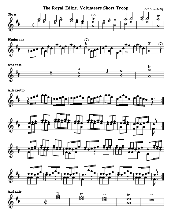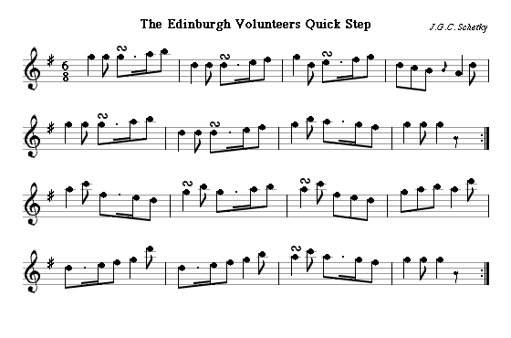J.G.C. Schetky, the cellist-composer friend of Burns, had been trained in Continental Europe and was in his element writing the sort of marches the Volunteers wanted. The Edinburgh Volunteers March and Quick Step is a flute version, sold as a sheet by Neil Stewart. The Right Honorable Henry Dundas's Royal Edinburgh Volunteers March and Quick Step was also published by Stewart. The Royal Edinr. Volunteers Short Troop is also from a single-sheet publication. This version is a two-part one for fifes; it was printed together with one for piano. What it lacks in military aggression it makes up for in Mozartian melodic attractiveness.