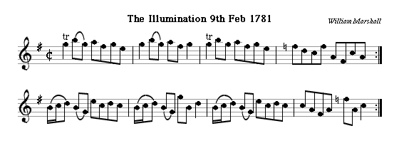 Marshall was reputed to be a Tory adherent of the Episcopalian church, and as such not a likely sympathizer with Lord George's opinions. But Lord George Gordon's Reel, one of the first tunes Marshall composed, is placed right at the head of his collection of 1781. Whatever the personal motives and family loyalties involved, the fact that Marshall was willing to celebrate Britain's most notorious agitator for cheating the rope suggests there was more in his politics, at least at that time, than his biographer tells us. He later changed the title to Mrs L. Stewart's Reel - of the Island of Java, presumably because Gordon was by then forgotten and Mrs Stewart was paying. He rewrote the second half at the same time; I've given the original one. The Illumination similarly had its title changed to The Fochabers Rant; it was also reprinted as The 19th of February by William Campbell, probably a simple mistake.