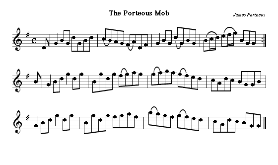 The Porteous Mob is another tune by James Porteous, who made a specialty of writing silly happy little tunes about ghoulish subjects. I have no idea if he was related to the Captain. He commemorated another Porteous who met a melodramatic end in The Spedling Castle's Ghost's Dance, about a Gypsy who was absent-mindedly left to starve to death in the private jail of the Jardines of south-west Scotland, so he may just have enjoyed the coincidence.