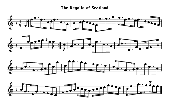 The strathspey and reel The Regalia of Scotland are from a dance sheet published by James Davie of Aberdeen at the time the jewels were rediscovered. A far less appreciative response was Lady Nairne's song The Regalia. This must have been written around the time of George IV's visit, when Nairne and her husband had just been evicted at short notice to make the royal apartments at Holyrood available for the King. Personal slight was mixed with her familial political leanings to produce one of the toughest and least clichéd of all the post-1745 Jacobite anthems. She probably wrote its march tune herself.