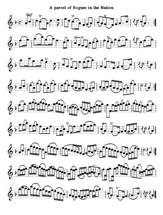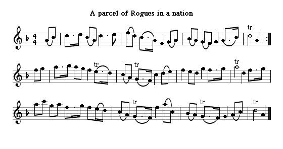 I have included two instrumental settings of Parcel of Rogues, both from the middle of the 18th century. The first is by William McGibbon and the second (with two variations) is by James Oswald, from the Caledonian Pocket Companion. Both must be meant for the flute. It is not easy to imagine somebody leading a riot while playing either of them.