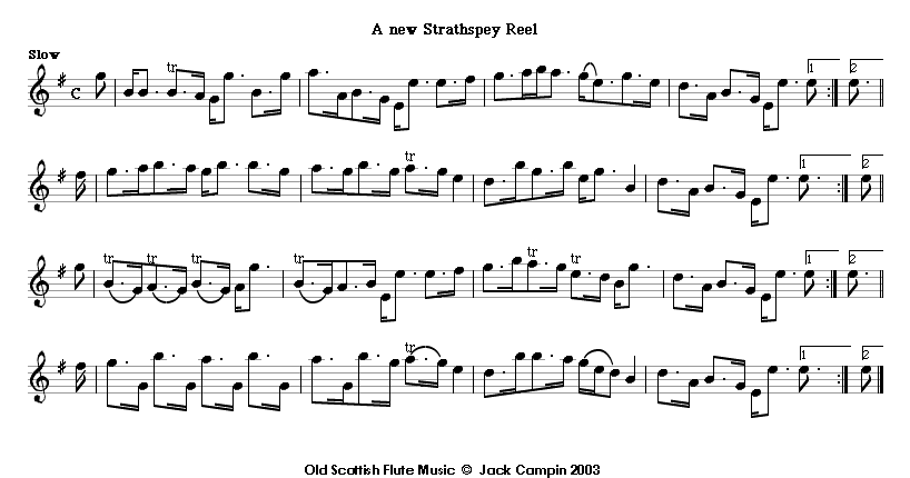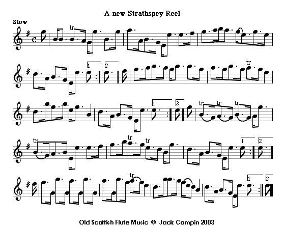 The two pieces called A new Strathspey Reel are from James Oswald's Caledonian Pocket Companion of 1743-48, and are the earliest known tunes described as strathspeys. Strathspeys are often thought of as essentially fiddle music, but the first of these is almost impossible on a fiddle and must have been intended for the flute. Oswald's own instrument was the cello, and cello music may superficially resemble flute music, because of the C at the bottom of its range. There are a few tunebooks from later in the century explicitly aimed at both instruments. But Scottish cellists weren't a likely market for his book; Oswald himself was probably the only one of his time who could play music as complex as this.