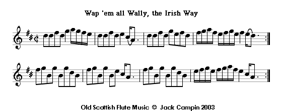 The strathspey and reel, sometimes based on the same underlying melody, is one of the commonest pairings of tunes in Scottish music. Wap 'em all Wally, or up an war them all Wally and Wap 'em all Wally, the Irish Way form one of the oldest such pairs; they're from Bremner's The Delightful Pocket Companion for the German Flute published in London after he moved there in the late 1760s. The reel is very similar to Tail Todle, which the Gows thought was Welsh.