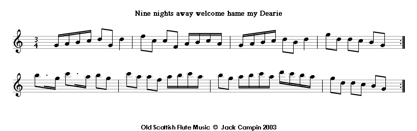 Nine nights away welcome hame my Dearie is a triple-time hornpipe from John Hamilton's Complete Repository for the German Flute. Another variant of the tune is known from manuscripts around 1700, mostly from northern England, as Three Sharp Knives or Punchinello, and from other Scottish sources as Old Age and Young.