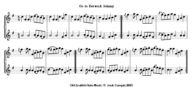 Go to Berwick Johnny is the best-known Scottish triple-time hornpipe, first recorded from Edinburgh as the tune of a children's nonsense song and later given a set of bogus-historical nationalistic words. Another title for the tune in an old manuscript is Go to Barrack Johnny - perhaps it was once a recruiting dance.