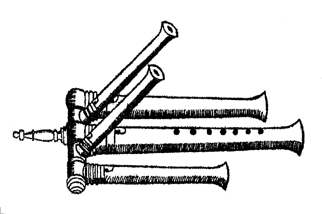 An identical instrument may be found in the Museo Civico, Bologna, comprising a recorder four drone pipes joined by a common tube and blown through a mouthpiece. It is said to have been invented by Manfredo Settala. There is a vanitas painting by Evaristo Baschenis that includes both a flauto harmonico and a portrait -- possibly of Settala as a clown. A copy has been made by Rainer Weber.For more information, see the following references: